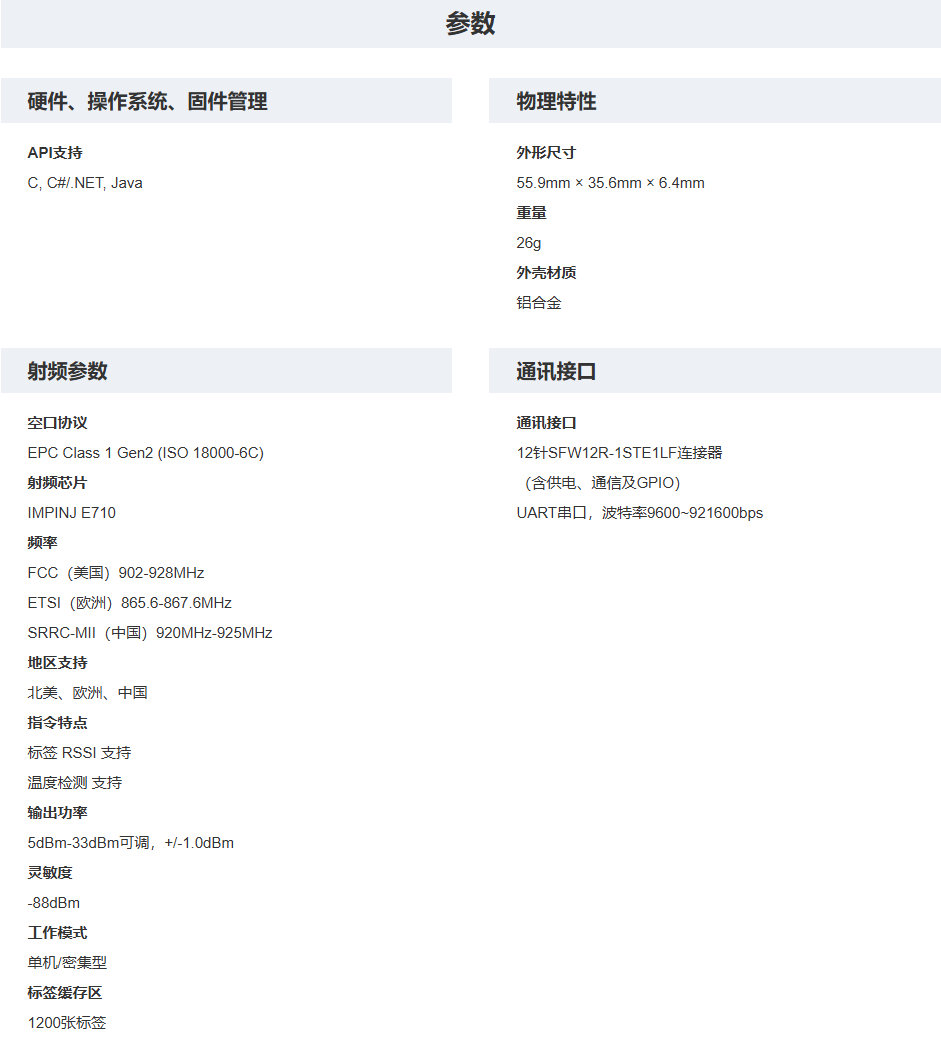 采用IMPINJ全新一代E710超高频射频读写器芯片,灵敏度高,读取范围广,功耗低,性能强大。