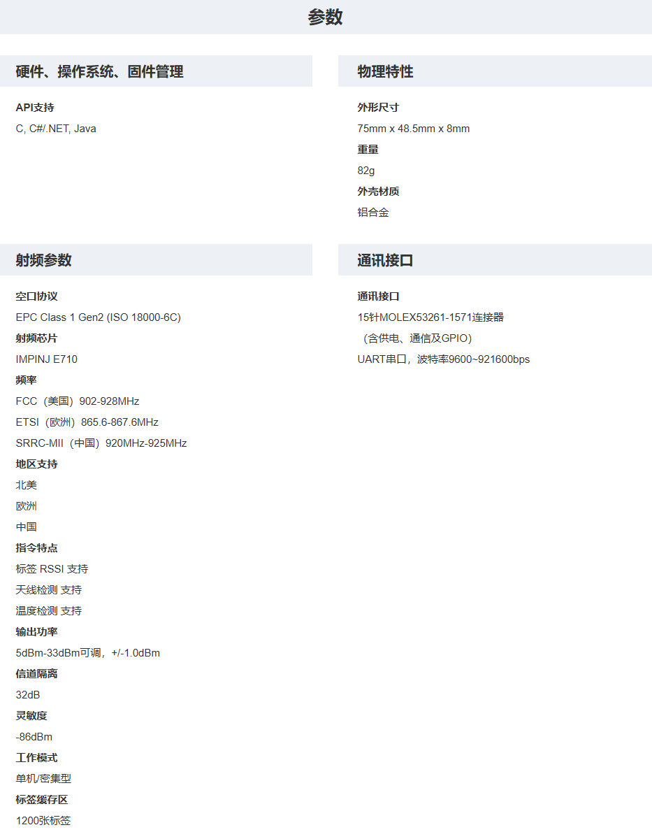 采用IMPINJ全新一代E710超高频射频读写器芯片,灵敏度高,读取范围广,功耗低,性能强大。