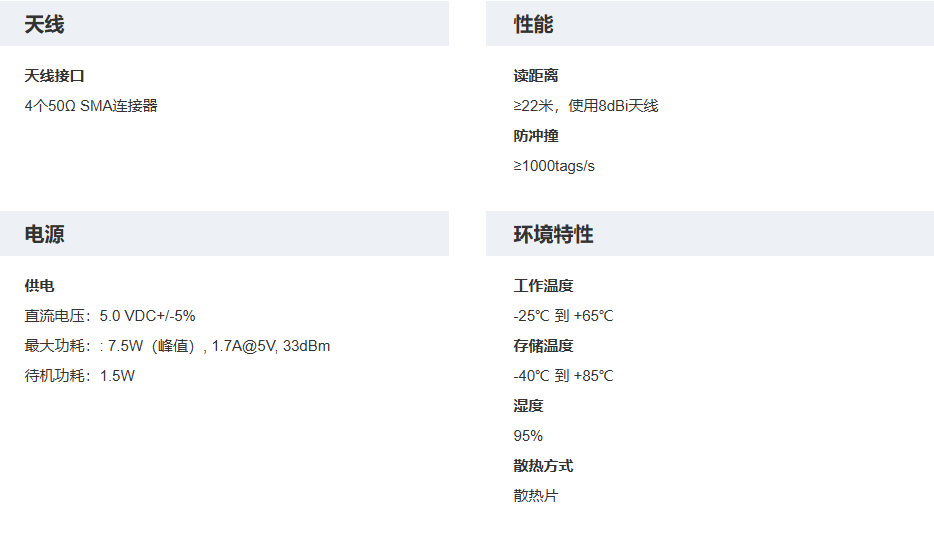 读取标签速度快,读取稳定,多标签防冲撞能力强,读取距离远,使用8dBi天线时,读取距离大于22米,多标签读取速度快,可达1000张/秒。