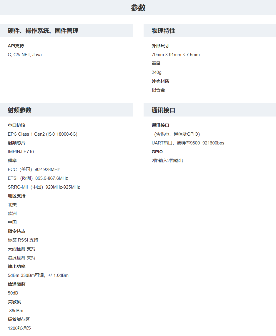 采用IMPINJ全新一代E710超高频射频读写器芯片,灵敏度高,读取范围广,功耗低,性能强大。