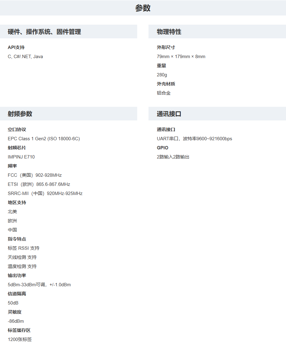 采用IMPINJ全新一代E710超高频射频读写器芯片,灵敏度高,读取范围广,功耗低,性能强大。