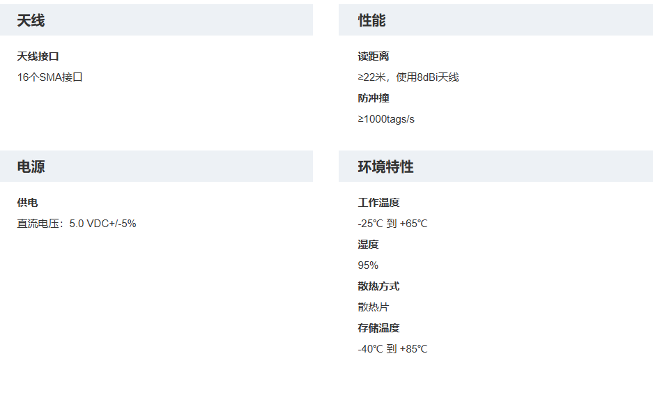 读取标签速度快,读取稳定,多标签防冲撞能力强,读取距离远,使用8dBi天线时,读取距离大于22米,多标签读取速度快,可达1000/秒。